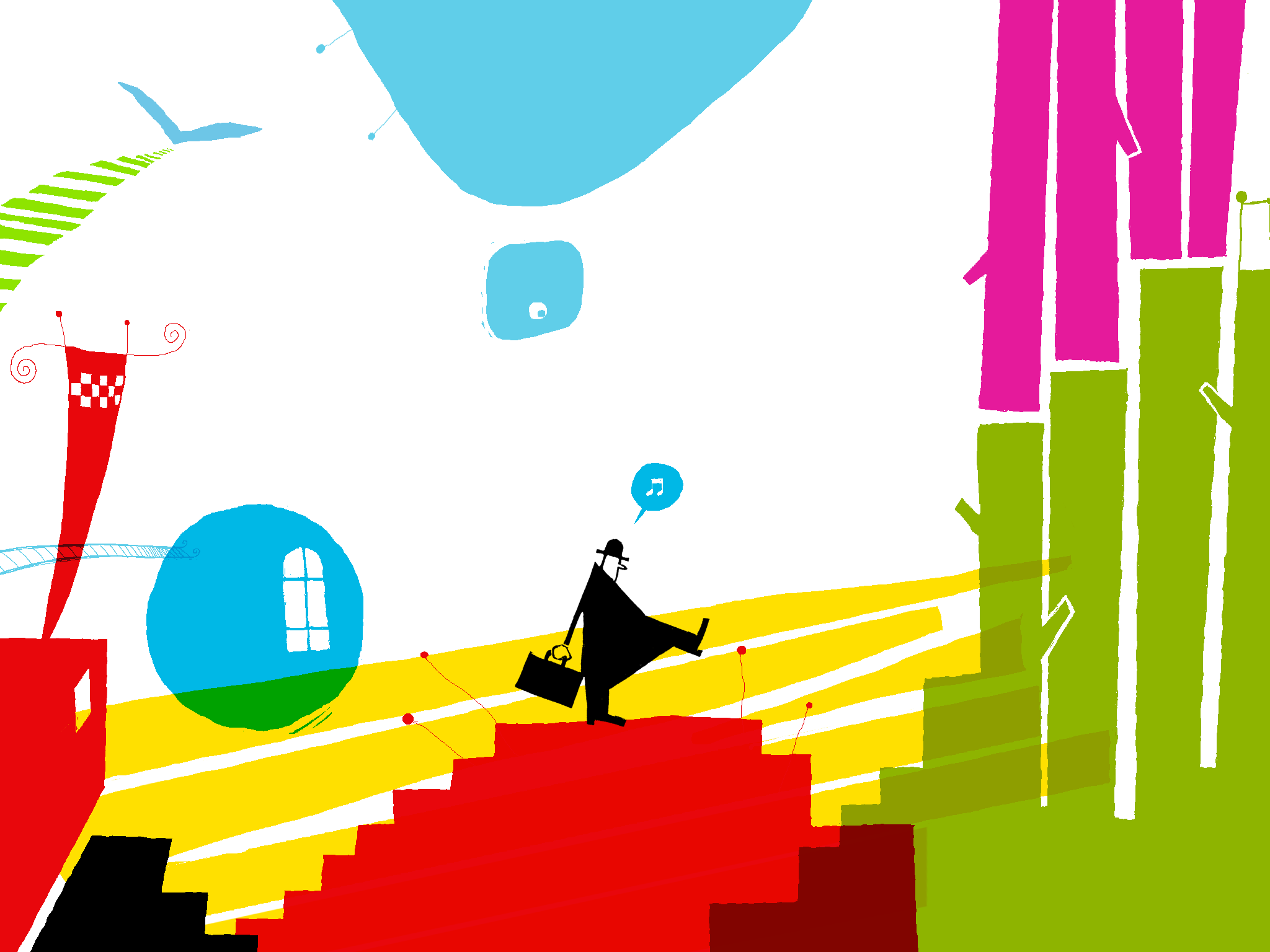 L’app interattiva senza parole BOUM! pubblicata da Les inéditeurs maison d’éditions interactives si apre con una sequenza fluida che scorre, lunga, lenta e leggera, tutta in verticale : casuali note sparse, il soffio del vento, sassofono e xilofono inattesi, il suono di una sirena, le rane. Geometria in bianco e rosso, finestre, colonne e porte; il cappello (una bombetta) è in caduta libera, scompare e ricompare, se non si interagisce cala all’infinito, ruota su se stesso, farfalleggia tra gli…
