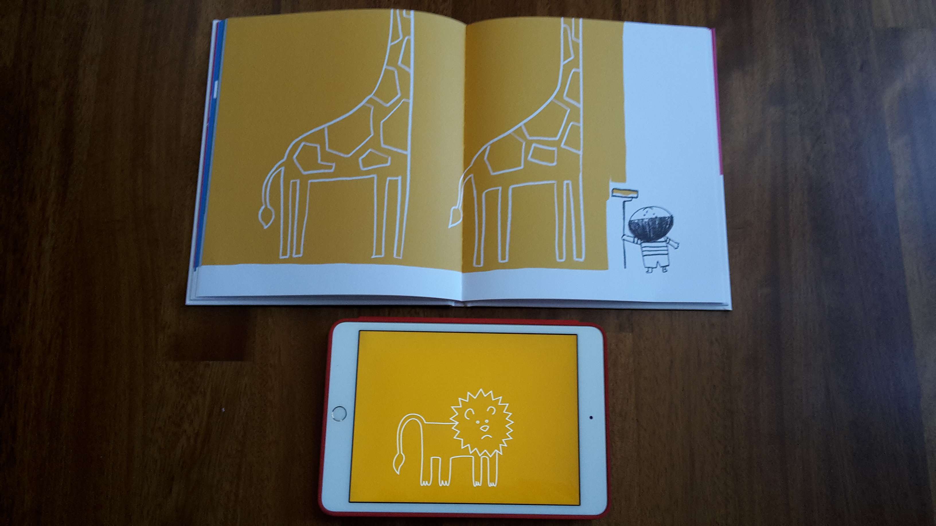 Storia, interattività e giochi didattici integrati nell’app. Apertura della bookapp su tavola esplicativa, sintetica e immediata quindi utile. Dall’icona con le bandierine si sceglie la lingua (inglese o italiano), dal punto interrogativo si accede all’indice, l’altoparlante – ormai lo sappiamo – regola l’audio; la freccia, in quella commistione intuitiva di avvio tra lo start tecnologico e il voltapagina cartaceo, fa partire l’avventura. Non si sa se Ban sia nata prima stampata a colori, su cartoncino…